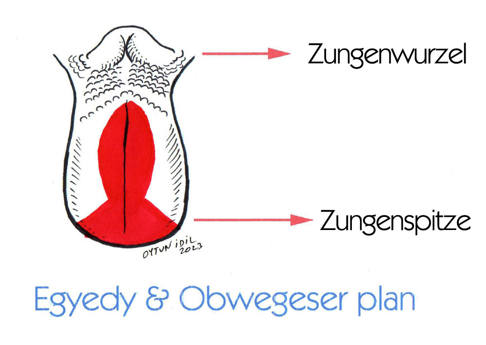 - Bei der Planung der Operation sollte darauf geachtet werden, dass die Geschmacksempfindungen der Zunge möglichst wenig beeinträchtigt werden. Wir bevorzugen in der Regel die Zeichnung von Egyedy & Obwegeser aus den vielen Operationsplänen. Bei diesem Operationsplan wird die Zunge so weit wie gewünscht verkürzt und verengt. Auch die Geschmacksfunktionen der Zunge sind nicht beeinträchtigt.